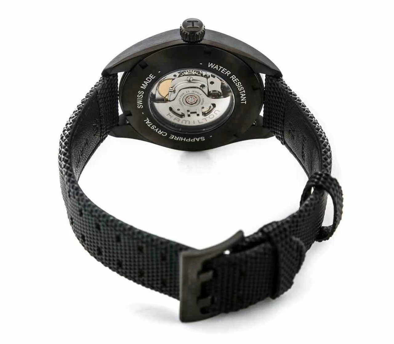 - Black textile strap with tang clasp